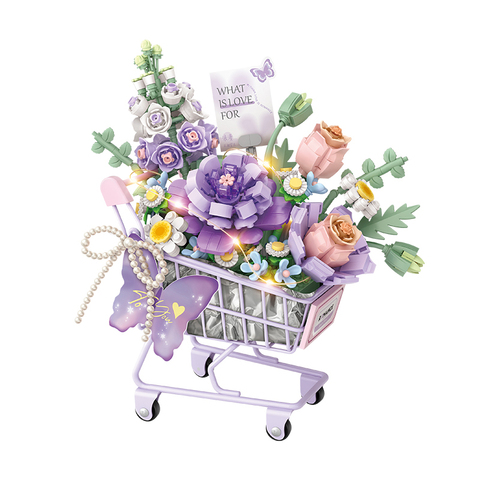 Modèle éducatif de chariot à fleurs romantiques violettes en blocs de construction miniatures en plastique ABS, 586 pièces, avec lumières, pour les 8 ans et plus